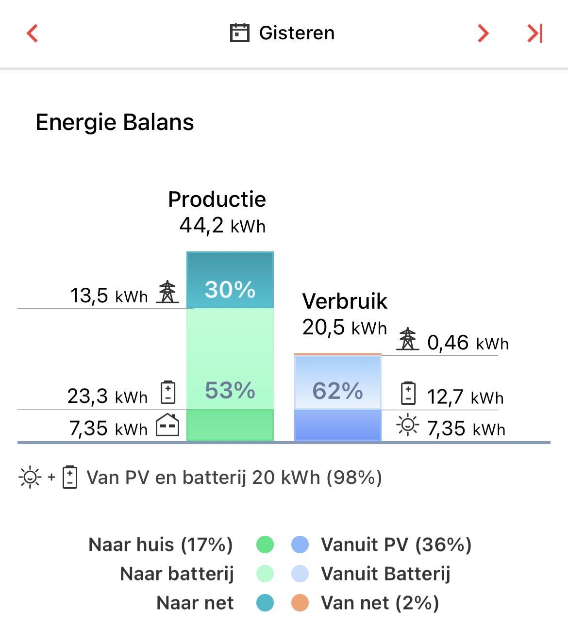 Met dagen zoals de afgelopen week is er door ons geen verbruik vanaf het net en daarmee ook geen gebruik van de 50% fossiel opgewekte stroom.