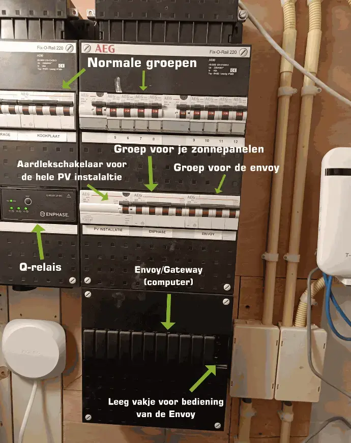 Op de foto zie je de complete meterkast van iemand met zonnepanelen, inclusief een Envoy-S Metered met meetspoelen. We hebben bij elk onderdeel aangegeven wat het is, zodat je een duidelijk overzicht hebt. Onderaan de foto zie je de behuizing voor de Envoy/Gateway, waar we in dit artikel specifiek op ingaan. Het kan zijn dat het in jouw geval anders is opgebouwd, maar al deze componenten zou je moeten kunnen terugvinden in jouw groepenkast.