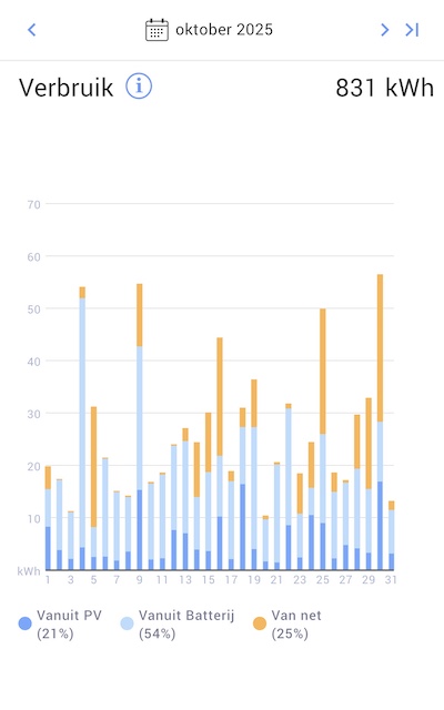 Het verschil tussen beide jaren zit niet alleen in het absolute verbruik, maar vooral in de manier waarop die energie is opgewekt en gebruikt. In oktober 2025 werd slechts 209 kWh (25%) van het verbruik rechtstreeks vanuit het net gehaald. Ter vergelijking: in oktober 2024 kwam maar liefst 832 kWh (86%) van het net. Dat is een enorme verbetering in zelfvoorzienendheid.